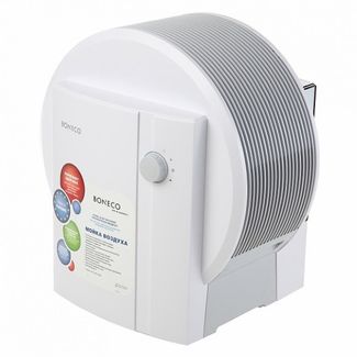 Мойка воздуха Boneco W1355A представляет собой комбинированный прибор (воздухоочиститель + увлажнитель) для естественного промывания воздуха, антибактериальной защиты и устранения аллергенов. Оригинальная конструкция не требует специальных фильтров, а элегантный дизайн гармонично вписывается в интерьер любого помещения. Мойка воздуха состоит из резервуара для воды, набора увлажняющих дисков, двух шагового переключателя, базы и электродов для ионизации воды. В верхней секции расположены монитор вращения дисков и вентилятор.Пластиковые диски имеют сложную гидродинамическую форму и отличаются бесшумным вращением. Усовершенствованная конструкция увлажняющих дисков позволяет увеличить производительность прибора. В частности, благодаря изменению формы лопастей зачерпывается в полтора раза больше воды.Прибор мойки воздуха имеет два режима работы:I слабое увлажнение;II сильное увлажнение.Нужное положение устанавливается с помощью переключателя.Увлажнение воздуха осуществляется за счет увлажняющих дисков, постоянно проходящих через находящуюся в приборе воду. Однако поверхность дисков находится над водой, что позволяет обеспечить мягкое увлажнение воздуха.Принцип увлажнения саморегулируется, производительность зависит от уровня влажности в помещении и температуры воздуха. Максимальная относительная влажность составляет примерно 50-60%.Система пластиковых дисков поднимает из резервуара воду и преобразует ее в мелкодисперсную водяную пыль. Полученная водяная баня не только увлажняет воздух, но и удаляет из него вредные частицы: пыль, грязь, пыльцу растений, частицы волос и шерсти животных и прочие аллергены.В мойке воздуха используется ионизирующий серебряный стержень для биологической очистки испаряемой воды. Он выполнен из антисептических волокон, уничтожающих более 650 видов бактерий и вирусов. В процессе обеззараживания воды новые ионы серебра заменяют старые, оторвавшиеся с поверхности. Такой механизм обеспечивает