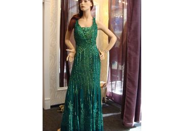 Вечернее платье изумрудного цвета из натурального шелка с вышитым узором из пайеток. Открытая спинка.