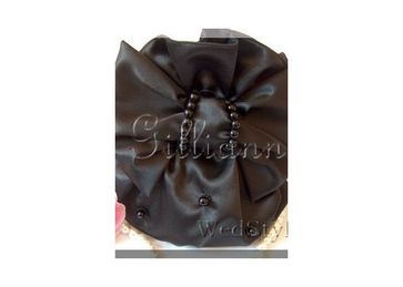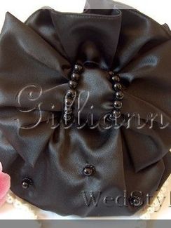 Атласная сумочка черного цвета в стиле мадам Помпадур. По центру сумочки сделан большой атласный бант. Вся сумочка расшита черным агатом и черным чешским бисером. Только ручки-утяжки из атласных лент. Жёсткое дно сумочки не даёт ей терять форму.