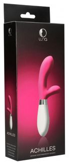 Achilles – вибромасссажер-кролик. Эта игрушка имеет особую эргономичную форму с закругленной, имеющей определенный уклон головкой, и гибкий клиторальный отросток, что делает стимуляцию более целенаправленной. Вибромассажер имеет два мощных двигателя, по одному в каждом отростке, обеспечивающих 10 функций вибрации, способной достигать 7000 оборотов в минуту, при этом уровень звука не превышает 50 дБ. None