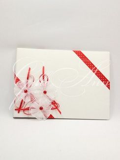 Альбом для свадебных пожеланий Gilliann Red Retro AST070 Альбом для свадебных пожеланий Gilliann Red Retro выполнен в молочно-красных тонах, отражающих модные тенденции ретро-стиля. Обложка декорирована красными ленточками в горошек и композицией из пышных цветов с хрустальными сердцевинками. На первой странице альбома печатаются имена молодоженов и дата торжества, на последующих предусмотрены строчки для имен гостей и текста пожеланий. Приятно услышать теплые слова от близких и друзей в день свадьбы, но, к сожалению, эти счастливые мгновения очень мимолетны. Красивая книга для свадебных пожеланий сохранит самые ценные воспоминания о Вашем торжестве и позволит в любой момент мысленно перенестись в атмосферу праздника и веселья. Материалы и декор: атлас, атласные ленты, картон, дизайнерская бумага, фатин, хрустальные бусинки. Базовые цвета: молочный, красный (возможно бесплатное изменение на другие цвета). None