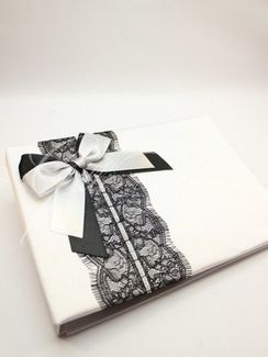 Книга пожеланий Gilliann Dark Fantasy AST042 Книга пожеланий - один из предметов коллекции Dark Fantasy. Оригинальное дизайнерское решение - на белом атласе выделяется полоса черного кружева с затейливым рисунком. Обложка украшена бело-черным бантом, на котором большой капелькой свисает большая продолговатая бусина. Книга отлично впишется в интерьер, если он будет оформлен в черно-белых тонах стиля ретро. Материалы и декор: атлас, атласные ленты, кружево, бусины, бумага. None