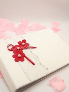 Книга пожеланий Gilliann Redrosso AST033 Оставлять пожелания в книге пожеланий становится хорошей традицией на свадьбах. Не все имеют возможность сказать тост, поздравить лично молодоженов, а книга - отличная возможность выразить свои искренние напутствия, советы, которые пригодятся супругам. Книга пожеланий - один из предметов коллекции Redrosso. Выполнена из атласа цвета айвори, по высоте обтянута полосой прозрачного кружева, усыпанного жемчугом. Обложку украшает три ярко-красных небольших цветка с жемчужинами в центре. Материалы и декор: атлас, атласные ленты, органза, декоративные элементы, жемчуг, бумага. None