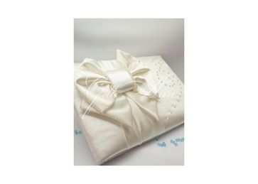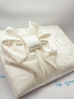 Книга пожеланий Gilliann Velvetta AST015 Книга пожеланий Velvetta - один предмет из полного комплекта. Выполнена из белого атласа с вышивкой жемчугом. Обложка декорирована атласным бантом. Внутри на титульной странице Ваши имена и дата свадьбы. По умолчанию, страницы в книге белые, обычные. Дизайнерские страницы обговариваются отдельно. Материалы и декор: атлас, жемчуг, бумага. None