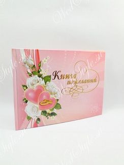 Книга пожеланий STA072 Книга с изображением роскошного букета роз и двух сердец с обручальными кольцами на розовом фоне. Мин. заказ 500 руб.