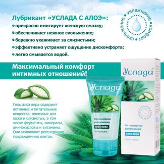Гель-лубрикант «Услада с алое вера» создан специально для интенсивного ухода за склонными к сухости слизистыми половых органов. Алое вера - уникальное растение, содержащее огромное количество полезных веществ, обладающих целебными свойствами. На протяжении многих веков оно успешно применяется для профилактики и лечения различных заболеваний. <br><br> Входящий в состав смазки сок алое содержит биоактивный комплекс, способствующий глубокому увлажнению, сохранению упругости и эластичности тканей интимных зон. Гель образует защитный, великолепно скользящий слой. При регулярном использовании смазка восстанавливает необходимый водный баланс.<br><br> Лубрикант «Услада с алое вера»:<br> - бережно ухаживает за слизистыми;<br> - активно питает и увлажняет ткани интимных зон;<br> - эффективно устраняет ощущение дискомфорта;<br> - способствует нормализации водного обмена;<br> - прекрасно имитирует женскую смазку;<br> - легко смывается водой.<br><br> Услада с алое вера - маскимальный комфорт интимных отношений! None