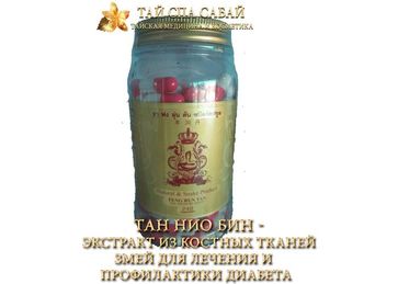 Тан Нио Бин - экстракт из костных тканей змей для лечения и профилактики диабетаTang Nio Bing - diabetes mellitus treatmentТан Нио Бин (Tang Nio Bing)- Экстракт из костных тканей змей и растений, применяется для лечения диабета.Фармакологическое действие: Препарат понижает уровень сахара в крови, способствует лечению побочных симптомов диабета, а именно плохой свертываемости крови и плохо заживающих ран. При регулярном приеме Tang Nio Bing уровень сахара в крови стабилизируется. Тан Нио Бин из костных тканей змей также применяется для профилактики диабетических инфарктов, тромбозов вен нижних конечностей, облегчения лечения трофических язв голени и стоп. Способ применения: принимать по 2-3 капсулы 2-3 раза в день перед едой, запивая теплой кипяченой водой. Для достижения максимального эффекта во время приема препарата необходимо продолжать ограничивать употребление сахара и сладостей. Необходимо непрерывно продолжать прием лекарства в течение 8 недель. Основные ингредиенты: Костные ткани змей, Гриб рейши, линджи (Ganoderma Japonicum), Женьшень обыкновенный (Pananax Ginseng С.А. Меу ), Кра Чай (Kaempferia Pandurata), ласточкины гнезда и другие редкие лекарственные тайские и китайские растения. 240 капсул