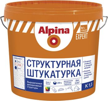 Назначение: Готовое и очень простое в применении матовое водоотталкивающее структурное покрытие для наружных стен.Типы поверхностей: Известково-цементные штукатурки и шпатлевки, бетон, дисперсионные шпатлевки, старые матовые дисперсионные краски.Свойства:Водоразбавимый материал, благодаря чему она очень проста и экономична в применении.Благодаря высокой паропроницаемости регулируется содержание влаги в основании, и фасад в целом становится более атмосферостойким.Структурная штукатурка Alpina Expert пригодна для самых различных сфер применения: для нанесения на бетон, минеральную штукатурку и шпатлеванные поверхности, а также на системы теплоизоляции фасадов.Сайт производителя: alpina-farben.ru Наличные, банковская карта, безналичный расчет Возможен самовывоз. Есть доставка.