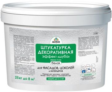 Назначение: Штукатурка финишная, позволяет получить рельефную шероховатую поверхность с эффектом "шуба".Типы поверхностей: Подходит для шпатлевки, штукатурки, бетона, гипса, кирпича, гипсокартона и других поверхностей.Свойства:Материал не требует идеально ровной подготовленной поверхности, скрывает мелкие дефекты стен.Образует твердое покрытие.Практически без запаха, нетоксичный.Пожаровзрывобезопасный.Экологически безопасный материал. Наличные, банковская карта, безналичный расчет Возможен самовывоз. Есть доставка.