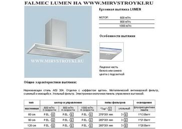 Кухонная вытяжка Falmec Lumen. Мощность - 800 м3/час при уровне шума 64 Дб. Производитель - Falmec Италия. Гарантия производителя 3 года. None