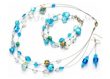 Лазурные, голубые и серебряные кубики, шарики, стразы, ромбики, сердечки и муррины из муранского стекла на струне. Ручная работа. Италия None