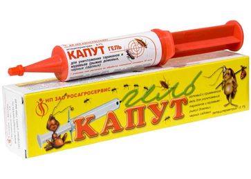 Инсектицидное средство “Капут” гель - готовый к применению гель для уничтожения тараканов и муравьев (рыжих домовых, черных садовых) на объектах различных категорий, включая детские, лечебные , пищевые, а также населением в быту. Действующее вещество препарата: Зетациперметрин - 0,1% - высокоактивное соединение, обладающее кишечно-контактным действием.