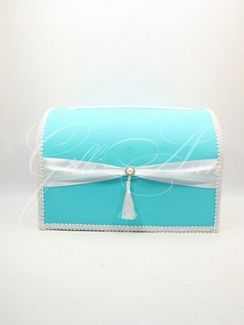Сундук для денег на свадьбу бирюзовый Gilliann Mystery BOX060 Сундук для денег, пожалуй, один из самых любимых, свадебных аксессуаров молодоженов. Ведь это первая семейная копилочка, которая быстро наполняется в свадебный день. Свадебный сундук принято, во время сбора подарков, «охранять» почетному свидетелю, а позже, пересчитать все подаренные деньги, огласить приглашенным гостям и в целости, и сохранности передать молодой семье. Это одна из самых приятных традиций на свадьбе. Сундук для денег на свадьбу бирюзовый Gilliann Mystery BOX060 изготовлен из дизайнерского картона, потом, мастер ручной работы обтянул его бархатной бумагой высшего качества. Окантовка сделана из объемной тесьмы белого цвета, этим же материалом с тонким, белым кружевом отделали прорезь для денег. В качестве главного, украшающего элемента использовали белую атласную ленту, которая проходит горизонтально по всему сундучку, на лицевой части имеется декоративный элемент в виде маленькой жемчужины, по контуру усыпанной стразами. Они превосходно переливаются при попадании на них лучей света. Вниз, от жемчужины, расположена небольшая бахрома, которая нарядно украшает свадебный сундучок. Прекрасно подойдет, практически, под все свадебные стили – от морского, до стиля Тиффани.