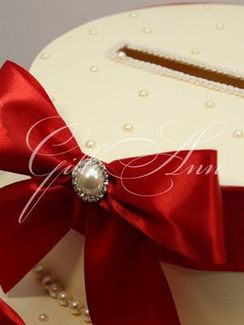 Давно ушли те времена в прошлое, когда на свадьбах деньги собирали в прозрачные банки, украшенные атласными лентами. С тех времен остались одни воспоминания. Сейчас, каждая супружеская пара, старается найти свой аксессуар, с изюминкой, чтобы он был не как у всех и обязательно запомнился гостям. Именно этим требованиям и отвечает свадебная казна для денег Gilliann Pearl Cake BOX043. Это не просто казна, а настоящее произведение искусства, смотрится достойно, дорого, с шиком. Изготовлена казна из дизайнерского картона молочного цвета, по форме напоминает два яруса торта разного диаметра. Каждый ярус украшен широкой атласной лентой ярко-красного цвета. С лицевой стороны завязаны красивые банты. В качестве отделки, в центр бантиков, вставлены декоративные элементы с жемчужиной, усыпанной мелкими стразами. Горизонтальные поверхности украшены половинками жемчужин, которые смотрятся оригинально. Сверху предусмотрено отверстие для конвертов и купюр, оно имеет достаточную ширину, чтобы деньги не мялись. Свадебная казна выполнена в глухом исполнении, нет потайного дна или застежек-липучек. Чтобы достать подарки, нужно разрезать дно у свадебного аксессуара.