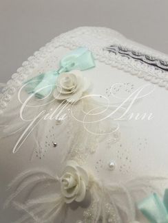 Свадебная казна для денег Gilliann White Rose BOX046 Казна для денег - крайне важный аксессуар, который пригодится во время дарения подарков, а также для всевозможных конкурсов, связанных с деньгами. Нарядная свадебная казна подчеркнет уважительное отношение к дарителю и подаркам, а также станет великолепным элементом торжественного свадебного декора. Свадебный сундучок Gilliann White Rose выполнен в виде ларца с отверстием для денег. Поверхность сундучка обтянута белым атласом, края украшены декоративной тесьмой. Боковая сторона украшена композицией из белых латексных розочек, перышек, мятных бантов, бусин и страз. Особую элегантность композиции придают завитки из перламутровых жемчужин. Выемка для денег декорирована кружевной тесьмой.