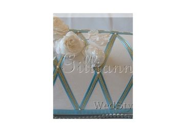 Свадебный сундучок Екатерининский сад – казна для денег на свадьбу. Сундучок в бело-сине-золотистых тонах. Декор из роз, листьев, лент, кружева и жемчужин. Сундучок обтянут фатином золотистого цвета.