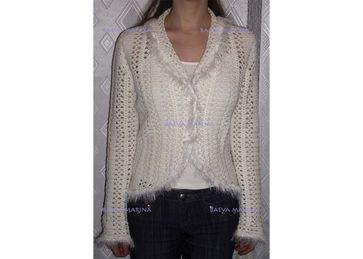 Жакет выполнен крючком из полушерстяной пряжи, отделка выполнена пряжей "травка".