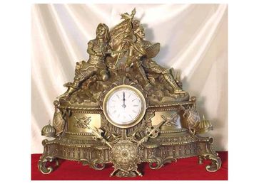 Вольная интерпретация западноевропейских образцов последней четверти 19 века в стиле историзм. На высоком цоколе с круглым циферблатом изображены два сидящих на пригорке рыцаря в средневековых латах. Один из них держит знамя, у другого в руках щит и меч. На цоколе по сторонам и в центре изображены военные трофеи, состоящие из копий, щитов шлема, палиц и доспехов.Часы "Гладиаторы", часы, часы каминные, часы настольные, часы настенны None