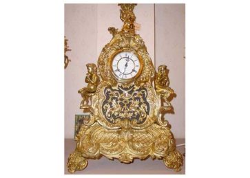 Вольная интерпретация французского образца, выполненного в переходном от барокко к рококо стиле. Корпус сложной барочной формы покрыт типичным рокайльным орнаментом (трельяжная сетка, раковины, листья). По сторонам от циферблата на корпусе часов изображены фигурки фавнов, играющих на свирелях. Фавн (римс.) – Пан (греч.) - божество стадов, лесов и полей, демон стихийных плодоносных сил природы, входящих в свиту бога Диониса. Изображается покр None