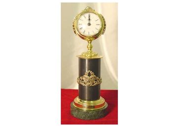 Часы «Подарочные» интересны формой корпуса, увенчанного пальметкой, расположенного на подставке в виде черного цилиндра, обрамленного шлифованной бронзой. В оформлении используется поделочный камень и накладки с разнообразной тематикой. Строгость и изысканность цветовой гаммы, современный дизайн в сочетании с благородным блеском бронзы или латуни, делает их неповторимым подарком. None