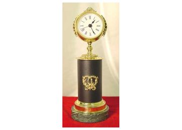 Часы «Подарочные» интересны формой корпуса, увенчанного пальметкой, расположенного на подставке в виде черного цилиндра, обрамленного шлифованной бронзой. В оформлении используется поделочный камень и накладки с разнообразной тематикой. Строгость и изысканность цветовой гаммы, современный дизайн в сочетании с благородным блеском бронзы или латуни, делает их неповторимым подарком. None