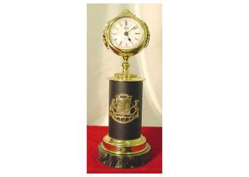 Часы «Подарочные» интересны формой корпуса, увенчанного пальметкой, расположенного на подставке в виде черного цилиндра, обрамленного шлифованной бронзой. В оформлении используется поделочный камень и накладки с разнообразной тематикой. Строгость и изысканность цветовой гаммы, современный дизайн в сочетании с благородным блеском бронзы или латуни, делает их неповторимым подарком. None