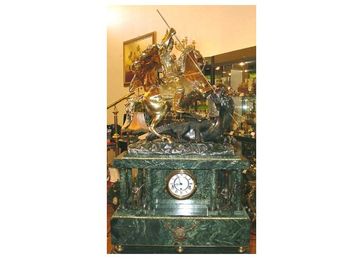 Эти часы точное воспроизведение часов скульптора А.Б. Логановского (исполнение Никольса и Плинке), украшающих Кремлевский дворец. Выполнены в стиле историзм. Часы состоят из двух частей: постамент напоминает вход в древнегреческий храм с колоннами, на котором скульптура Георгий Победоносец. Образ его на коне и поражающего змея вошел в герб Русского государства. Один из самых чтимых русских святых, покровитель Москвы и Русского государства. Ч None