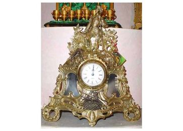 Часы "Удачная охота"Материал: Бронза Длина: 140 мм Ширина: 300 мм Высота: 370 мм Вес: 4500 гр Корпус часов украшен скульптурой мужчины в костюме 18 века, в одной руке он держит ружье, другой опирается на пригорок. Цокольная часть сложной рокайльной формы, под циф None