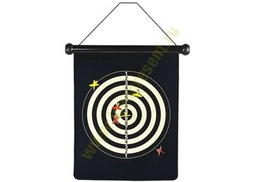 Классический дартс с одной стороны и мишень - с другой. В комплекте 6 дротиков и подарочный тубус.