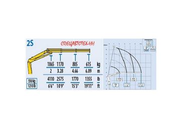 Характеристики КМУ EFFER 45 2S: Грузовой момент, тм 3,73 Максимальный вылет, м 6,09 Угол вращения, ˚ 380 Вес крана, кг 550 Грузоподъемность на максимальном вылете, кг 595 Базовая комплектация: