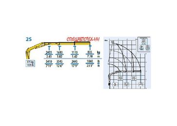 Характеристики КМУ EFFER 65 2S: Грузовой момент, тм 5,84 Максимальный вылет, м 7,15 Угол вращения, ˚ 380 Вес крана, кг 866 Грузоподъемность на максимальном вылете, кг 790