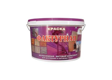 СВОЙСТВА: Белоснежная, матовая, акриловая, для внутренних и наружных работ, долговечная, пожаровзрывобезопасная, газопроницаемая, антибактериальная, влагостойкая, экологически безопасная. НАЗНАЧЕНИЕ: Фактурная краска предназначена для декоративной отделки степ и потолков. Образует декоративное рельефное покрытие паропроницаемое (дышащее), выдерживающее многократную влажную уборку. Применяется по бетонным, кирпичным, оштукатуренным и др. видам минеральных поверхностей.