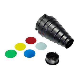 Байонет Bowens, длина конуса 20,5 см, изготовлена из металла, в комплекте цветные фильтры и сотовая насадка. Оплата: наличные, кредит. Есть доставка.