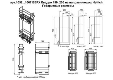 Бутылочница Квадро для верхних кухонных шкафов. Артикул производителя: 10.01.01.1.1.1 В базу по ширине: 150 мм. В базу по глубине: мин. 300 мм. Комплектация: Адаптер регулировки фасада Перегородки: в комплект не входят Поставляются с направляющими Hettich В базу 150 мм нагрузка на направляющие до 10кг. Крепление направляющих: левое (по умолчанию) Характеристики: Размер (база), мм: 150 Цвет: Хром Установка: Верхний шкаф Направляющие: Hettich Крепление направляющих: Левое Доводчик: Есть Высота (мм): 558 Ширина (мм): 100 Глубина (мм): 264 Материал: Сталь Тип бутылочницы: двухуровневая Тип выдвижения: Полное На некоторые товары необходима предоплата Есть доставка.