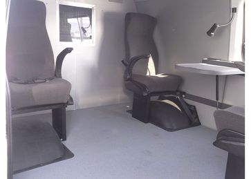 - Число мест патрульных: 7 (вместе с водителем)- Отсек для задержанных разделенный от основного салона металлической перегородкой с глухим окном из оргстекла с маленькими отверстиями- Цветографическая раскраска: Цветографическая раскраска и опознавательные надписи согласно ГОСТ Р50574-2002 с надписью «Передвижной пункт полиции» по левому и правому бортам- Врезные фароискатели с управлением из кабины – 2 шт.- Сигнальное громкоговорящее устройство- Боковая подножка сдвижной двери- Напольное покрытие – автолин- Дополнительный отопитель салона- Сплошная перегородка со сдвижным окном- Столик стационарный (откидной)- Остекление салона (1- раздвижное, 1- глухое в двери)- Сиденья для сопровождающих мягкие – 4 шт.- Потолочные светильники внутреннего освещения салона - 2шт.- Вентиляционный люк аварийный выход (заводской)- Металлическая перегородка отсека для задержанных, отделанная композитным материалом- Задняя перегородка отсека для задержанных в виде решетки с дополнительной дверью с задвижкой и замком- Освещение отсека для задержанных: 2 светильника в защитном корпусе- Вытяжное вентиляционное устройство в потолке отсека для задержанных: вентилятор в защищенном корпусе- Проводка вентиляции в защитном корпусе- В отсеке для задержанных пол автолин, стены и потолок отделаны окрашеным металлом- Две лавки для задержанных (металлический каркас, сиденья - дерево)- Поручни для наручников под лавками