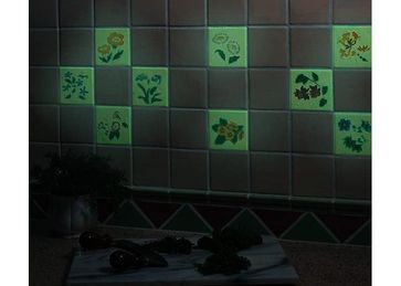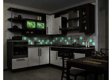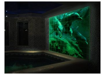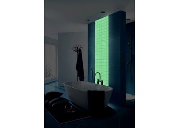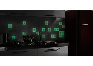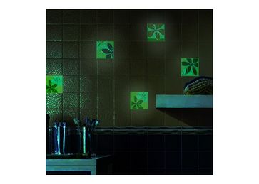Отделочная декоративная плитка,светящаяся в темноте. Размеры 10*10см, толщина 4,5мм. Цвет белый,цвет свечения бело-зеленый. Возможность нанесения вашего изображения на плитку. Цена плитки с изображением зависит от сложности рисунка и в среднем составляет 3500 рублей за 1 кв.м.