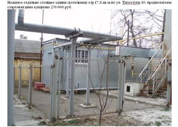 Продаётся нежилое отдельно стоящее здание (Котельная) о/п 17,8 кв.м. по ул.Тихоступа 19 (Администрация) Предполагаемая стартовая цена аукциона 250 000 руб. Подробности по тел.8-8617-21-14-92,8-9887-653-663,8-908-678-49-88 г.Новороссийк, Анапское шоссе 15, оф.108