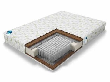 С двух сторон расположены пласты кокосовой койры. Жесткий натуральный слой хорошо пропускает воздух и усиливает ортопедические свойства блока независимых пружин. Между основой и наполнителем находится защитный экран из термовойлока. Он предотвращает трение материалов и продлевает срок службы изделия.