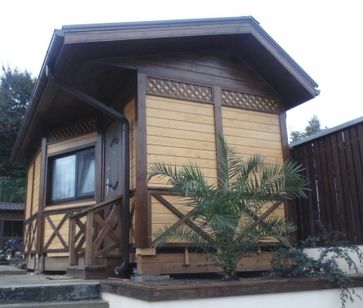 Садовый домик с лаконичным дизайном изготовлен из дерева хвойных пород