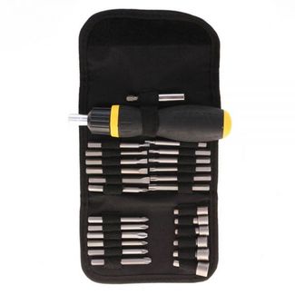 Набор универсальный в комплекте с отверткой, снабженной реверсом. Комплектуется матерчатой сумкой для хранения.