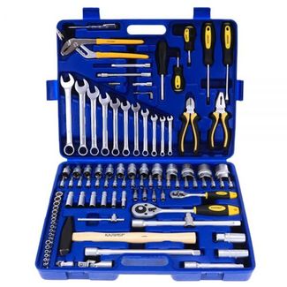 Универсальный набор слесарно-монтажного инструмента из 99 предметов, изготовленный из CrV стали с покрытием, защищающим предметы в наборах от коррозии.
