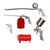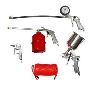 В набор покрасочный с верхним бачком входит 5 предметов: -краскопульт с верхним бачком -пневмопистолет продувочный -пневмопистолет с монометром -пневмопистолет мовильный -шланг гибкий спиральный полиуретановый. Набор предназначен для шиномонтажных, покрасочных, антикорозийных и других работ, связанных с иcпользованием лакокрасочного инструмента. Все комплектующие снабжены быстросъёмными разъёмами с присоединительным размером 1/4". Технические характеристики: диаметр сопла - 1.4 мм, объем бачка - 600 мл, рабочее давление - 50-70 psi, расход воздуха - 1.6-4.0 CFM. None