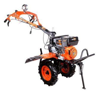 Мощный мотоблок с многодисковым сцеплением в масляной ванне и шестеренчатым редуктором укомплектован фрезами и пневматическими колесами, что позволяет использовать мотоблок для культивирования, сразу "из коробки". Ножи на фрезах имеют усиленную "серповидную" конструкцию с измененной геометрией по длине ножа, такая форма специально разработана для работы по различным почвам и используется в почвофрезах на тракторах. Универсальный узел сцепки — самый распространённый и дает возможность устанавливать разнообразное навесное оборудование: плуги и окучники различной конфигурации. Тележка для мотоблоков подходит практически любая, а если и понадобится переделка, то она будет минимальна и ее можно произвести без обращения в сервисный центр. Наличие регулируемой фары на руле позволит использовать мотоблок в темное время суток. Отдельно можете приобрести и установить роторную косилку, помпу, тележку, плуг, окучник, картофелевыкапыватель, а если установить гусеничную приставку, то получится мотобуксировщик для движения по глубокому снегу и бездорожью. None