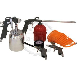 Набор пневмоинструмента Калибр НП-5Н включает в себя 5 предметов: краскопульт, насадка для подкачки шин, шланг, насадка для распыления воды, насадка для работы сжатым воздухом. Корпусы инструментов выполнены из металла, что обеспечивает надежную защиту внутренних узлов от повреждений при ударах и падениях. Комплект используется в гаражах, домашних мастерских, автосервисах, на мебельном производстве, при мелких посадочных работах. None