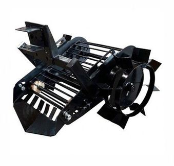 Картофелекопалка для мотоблока является навесным оборудованием и предназначена для механизированного выкапывания клубней картофеля и овощных культур с последующим отсевом земли и выкладкой клубней на поверхность почвы для дальнейшего ручного сбора. Кроме этого механизм можно использовать для собирания лука, свеклы, чеснока. Модуль состоит из лемеха (ножа) и просевной решетки (грохота ). Возможно регулирование глубины выкапывания с помощью сцепки, мягкость воздействия на грунт и клубни регулируется с помощью оборотов двигателя мотоблока. Картофелекопалка предназначен для работы на легких и средних почвах при влажности не более 27%, засоренных камнями до 8-9 т/га, при твердости почвы до 20 кг/см2. Совместимость с мотоблоками типа: НЕВА, Каскад, Фаворит и мотоблоками аналогичной конструкции. Колея колес агрегата — 54 см; а рабочая скорость составляет 2 км/ч; None