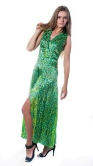 Платье отрезное по линии талии, приталенного силуэта с вертикальным разрезом по переду юбки из итальянского шелка цвета изумруд, прекрасно подчеркнет стройность фигуры! Перед и спинка оформлены "запахом", спинка полуоткрытая,горловина обработана обтачкой.