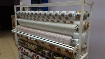 Металлическая конструкция стойки позволяет демонстрировать рулоны клеёнки, которые вывешиваются с обеих её сторон. На стойке 16 мест под рулоны.