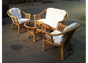 Диванчик на двоих с матрасом, два кресла с подушкой для сидения, стол круглый со стеклом. Цвет ротанга мед, т. коричневый