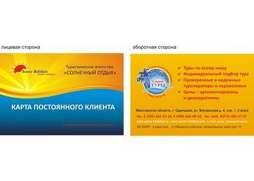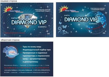 Данные карты позволят нашим клиентам получить дополнительные скидки, подарки, привилегии и услуги позволяющие оформить и провести отдых в максимально комфортных условиях. Мы гордимся тем, что, предлагаемые нами туры, Вы выбираете постоянно это наилучшая оценка нашей работы.КАРТА ПОСТОЯННОГО КЛИЕНТА дает возможность выгодно путешествовать Вам, Вашей семье и Вашим друзьям.Мы ждем Вас в нашем Туристическом агентстве.Путешествуйте с нами больше. Существует три категории карт: ПОСТОЯННЫЙ КЛИЕНТ. Для того, чтобы стать обладателем КАРТЫ ПОСТОЯННОГО КЛИЕНТА, необходимо путешествовать с ТА СОЛНЕЧНЫЙ ОТДЫХ не реже 1 раза в два года. Карта выдается после оформления первого договора или при проведении акций компании. Привилегии и скидки которые получают ПОСТОЯННЫЕ КЛИЕНТЫ: скидка 3 % *личный менеджерподбор тура и консультация по телефону или в любом удобном для клиента местеполучение новостей туризма и специальных предложений по электронной почте **туристическая СИМ карта в подарокполучение дополнительных дисконтных скидок у партнеров компанииотправка документов по электронной почте GOLD VIP КЛИЕНТ. Для того, чтобы стать обладателем КАРТЫ GOLD VIP КЛИЕНА, необходимо путешествовать с ТА СОЛНЕЧНЫЙ ОТДЫХ не реже 2 раза в год. Карта выдается после оформления второго договора в течение одного года или при проведении акций компании. Привилегии и скидки которые получают GOLD VIP КЛИЕНТ: скидка 4 % *приоритетное обслуживание личный менеджерподбор тура и консультация по телефонуполучение новостей туризма и специальных предложений по электронной почте **туристическая СИМ карта в подарокполучение дополнительных дисконтных скидок у партнеров компаниидоставка документов в любое удобное для клиента место или отправка документов по электронной почте DIAMOND VIP КЛИЕНТ. Для того, чтобы стать обладателем КАРТЫ DIAMOND VIP