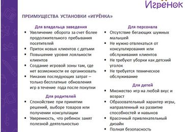 Установка интерактивного терминала«Игрёнок»– это идеальное решение проблемы. Дети будут вовлечены в познавательную игровую деятельность, а спокойные родители станут довольными и лояльными покупателями.